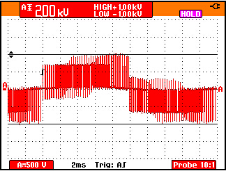 50 Hz馬達(dá)驅(qū)動輸出電壓的脈寬調(diào)制信號的細(xì)節(jié)。1000V,50 微秒的脈沖即導(dǎo)致某些測試設(shè)備的不穩(wěn)定。