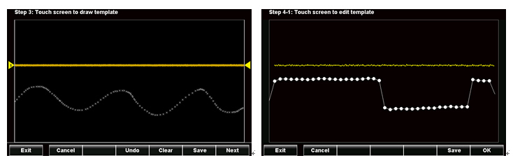許多的元件或系統(tǒng)制造業(yè)者在做質(zhì)量管制或是出貨生產(chǎn)時,需要良品與不良品的報告分析。GDS-300/GDS-200系列示波器依然保有固緯示波器原有GO/NOGO的功能,可以根據(jù)量測的波形,建立相對應(yīng)的波形模板,以進行通過與非通過的結(jié)果計算。除此之外,此示波器亦可進行模板自我編輯的功能,使用者可以根據(jù)測試或環(huán)境條件來任意編輯模板之型態(tài),亦可訂立不同之上下界模板,使得GO/NOGO的功能更加多元化以及人性化。