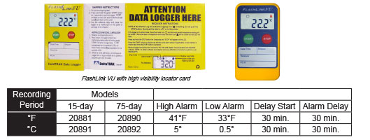 FlashLink VU 果蔬記錄儀 是專門設(shè)計(jì)用來(lái)記錄農(nóng)產(chǎn)品的貯存和運(yùn)輸溫度。記錄儀具有高/低報(bào)警設(shè)置預(yù)編程(41°F/33°F)。客戶運(yùn)輸農(nóng)產(chǎn)品可以使用這款一次性數(shù)據(jù)記錄儀。 它有一個(gè)大而易閱讀的液晶顯示屏,噴墨式溫度記錄儀,能夠提供即時(shí)的溫度信息和統(tǒng)計(jì)數(shù)據(jù),溫度記錄儀國(guó)儀棒圖,包括行程中的溫度上下極限、溫度超標(biāo)的累積時(shí)間、最高溫度、最低溫度和平均溫度。即 使是使用者不啟動(dòng)數(shù)據(jù)記錄儀,數(shù)字溫度記錄儀,其專利的影子記錄功能也能保證歷史溫度數(shù)據(jù)的獲取。