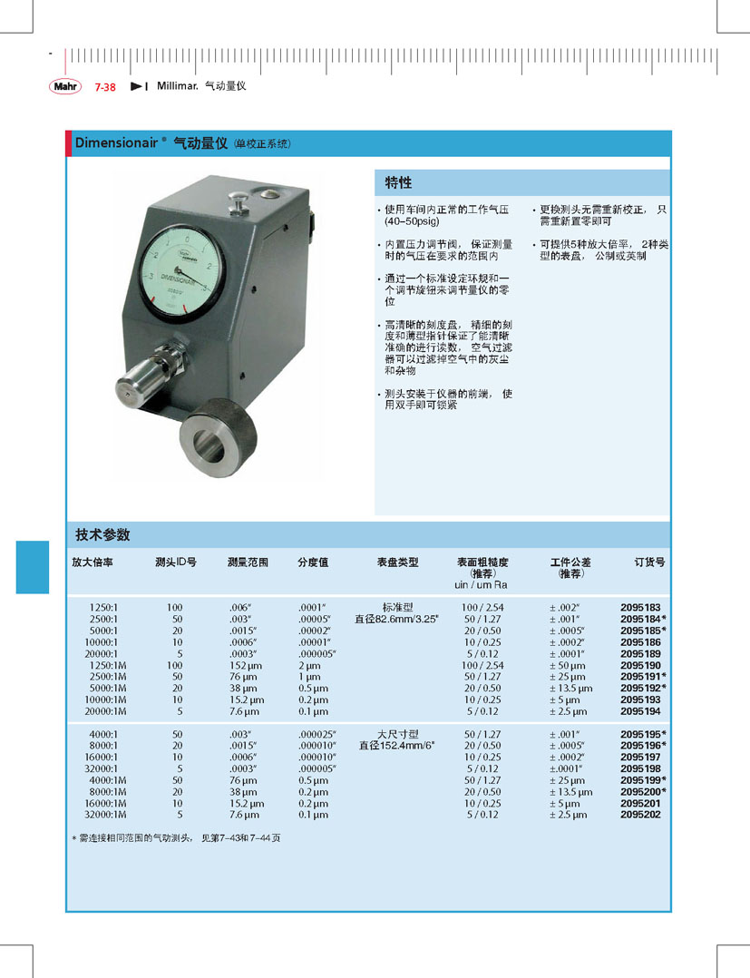 Mahr Federal Dimensionair 氣動(dòng)量?jī)x是氣動(dòng)量?jī)x中特有的一個(gè)類(lèi)型。屬于差壓式氣動(dòng)量?jī)x,活塞式壓力計(jì)生產(chǎn)廠家,它的優(yōu)點(diǎn)在于能提供一個(gè)合適的放大倍率和平衡的氣動(dòng)系統(tǒng)。一個(gè)線性的、準(zhǔn)確的校正比例為刻度的劃分、讀數(shù)提供了條件。