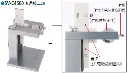 SV-C4500 系列使用專業(yè)校正規(guī)(標配附件),東京精密粗糙度儀官網(wǎng),通過改進使得上下兩方附帶從動件的上下圓錐測針能簡便易行地進行校正。Z1 軸增益、對稱性、探針半徑等繁瑣的校正工作一次便可完成。